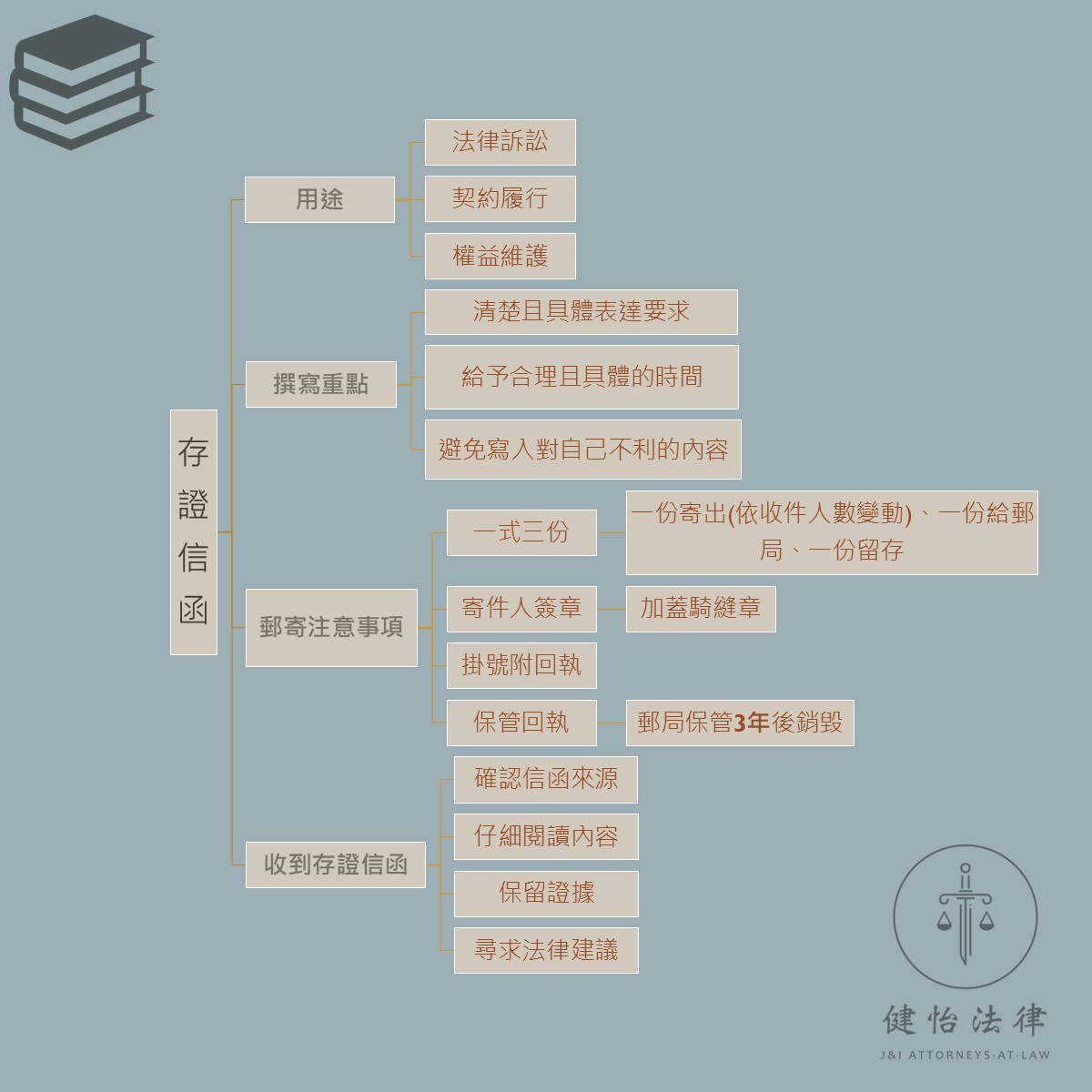 讓律師教你_存證信函是什麼-存證信函的法律效力-台北法律事務所 商品圖像 商品資訊 常聽到要寄存證信函,這在法律上有甚麼效力?又該怎麼撰寫?如果收到以後需要做甚麼? 存證信函主要目的是作為法律上的證明,證明某個事項已經被送達或通知到對方,但其並不具有法律上直接強制力。 以下心智圖簡單介紹存證信函。 商品Q&A 提問者稱呼 E-mail 手機 電話 留言內容 驗證碼